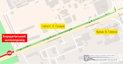 Рух парною стороною проспекту Л. Гузара від бульвару В. Гавела до Борщагівського шляхопроводу тимчасово організовано у два напрямки.