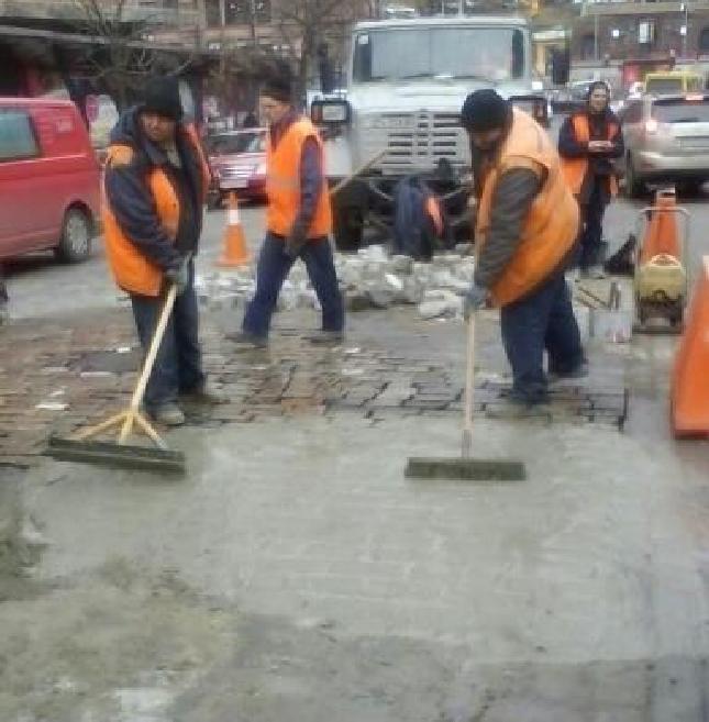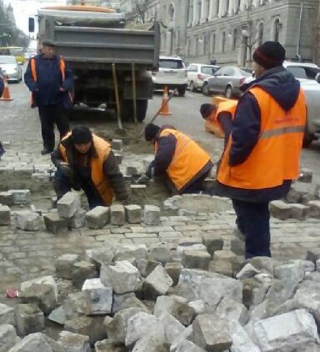 Відповідно до вимог Технічних правил ремонту і утримання вулиць та доріг, після виконання робіт з перевлаштування покриття з бруківки виконується догляд за ним на протязі 5-7 днів.