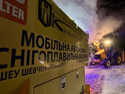 Долати наслідки негоди у Києві дорожникам Комунальна корпорація "Київавтодор" допомагають мобільні снігоплавильні установки.