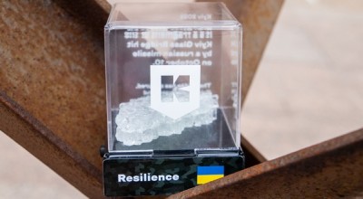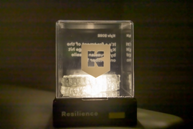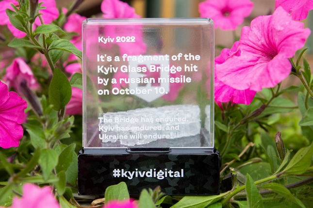 Благодійний лот надав Департамент інформаційно-комунікаційних технологій КМДА. Це унікальний уламок скляної конструкції 10*3,5 см із світлодіодом у захисному коробі. На корпусі міститься кнопка, що вмикає підсвітку. Загалом було виготовлено лише 100 таких сувенірів.