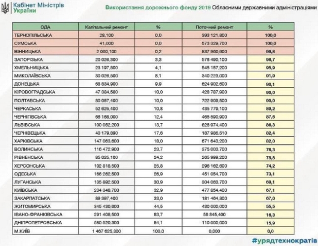 Кабінет Міністрів України опублікував дані щодо освоєння коштів на капітальні ремонти доріг різними регіонами за 2019 рік. Показники варіюються від 0% до 100%.