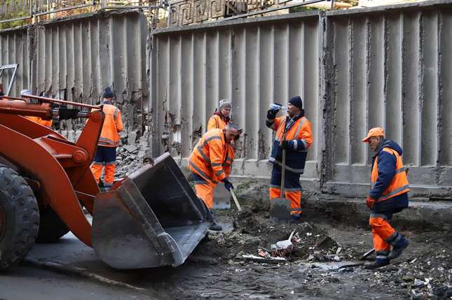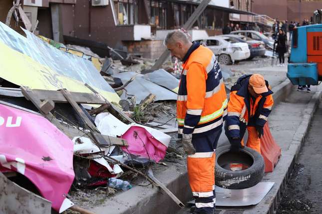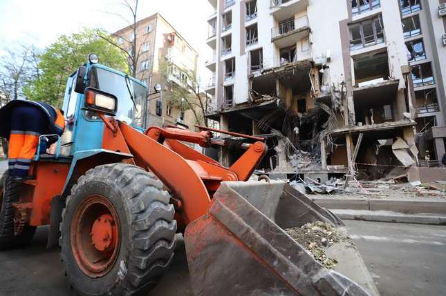 Київ долає наслідки ракетного удару: дорожники вивозять залізобетоні елементи, листи металу та скло з проїжджої частини, аби відновити проїзд вулицею