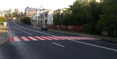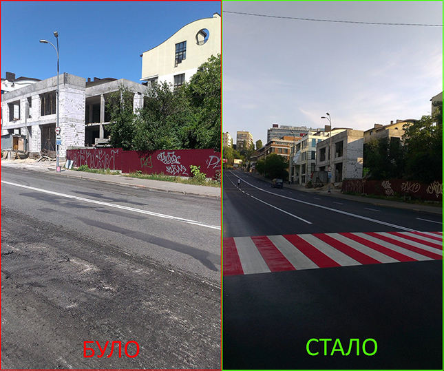 Окрім того, на новому асфальтобетонному покритті був влаштований черговий пішохідний перехід червоно-білого кольору з використанням холодного двохкомпонентного пластику. Вказаний перехід є потенційно аварійно-небезпечним об’єктом, тому таке технічне рішення є дуже актуальним та повинно мінімізувати можливість скоєння ДТП за участю пішоходів.