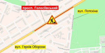 На частині Голосіївського проспекту виконають поточний ремонт. Працюватимуть на ділянці між вулицями Героїв Оборони і Потєхіна.