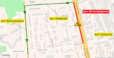 Під час робіт рух на частині вул. Автозаводської (у напрямку вул. Скляренка) буде перекрито. Також буде перекрито виїзд з вул. Пріорської.
