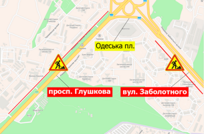НА ДУБЛЕРІ ПРОСП. ГЛУШКОВА І МІСЦЕВОМУ ПРОЇЗДІ ВУЛ. ЗАБОЛОТНОГО ЧАСТКОВО ОБМЕЖЕНО РУХ