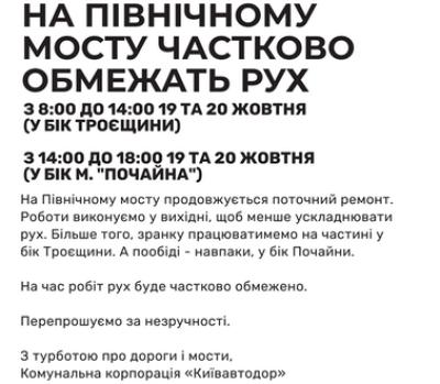 Роботи виконуємо у вихідні, щоб менше ускладнювати рух. Більше того, зранку працюватимемо на частині у бік Троєщини. А пообіді – навпаки, у бік Почайни.