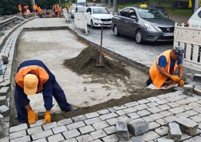 На Подільському узвозі оновлено близько 2,4 тис. кв. м покриття із бруківки та встановлено 758 м погонних бордюрів