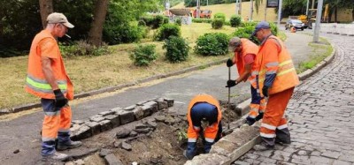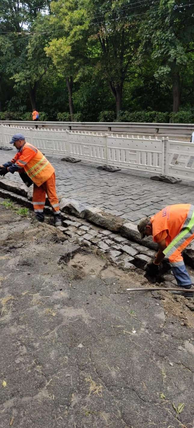 На Подільському узвозі виконують поточний ремонт. Оновлюють покриття із бруківки.