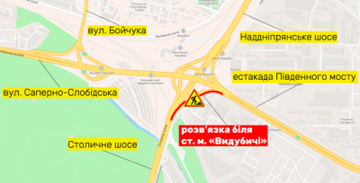 На розв'язці біля ст.м. «Видубичі» виконають поточний ремонт. Покриття оновлюватимуть на підйомі зі Столичного шосе на естакаду.