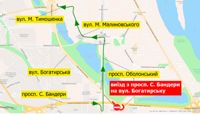 Схема об'їзду: просп. Бандери - просп. Оболонський - вул. Малиновського - вул. Тимошенка - вул. Богатирська