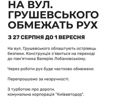 НА ВУЛ. ГРУШЕВСЬКОГО ОБМЕЖАТЬ РУХ З 27 СЕРПНЯ ДО 1 ВЕРЕСНЯ