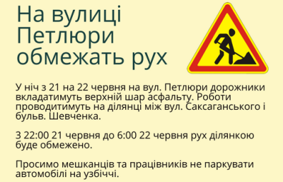У ніч з 21 на 22 червня на вул. Петлюри дорожники вкладатимуть верхній шар асфальту. Роботи проводитимуть на ділянці між вул. Саксаганського і бульв. Шевченка. 3 22:00 21 червня до 6:00 22 червня рух ділянкою буде обмежено.