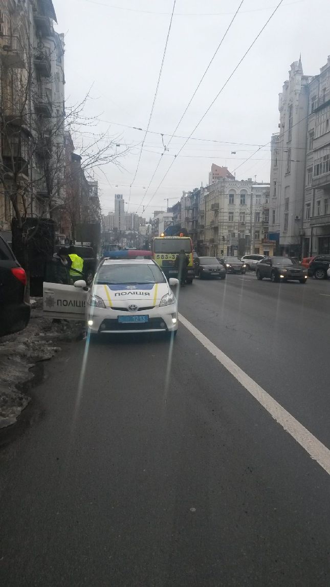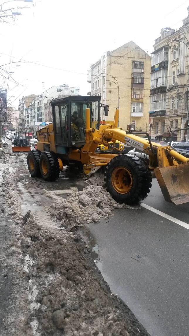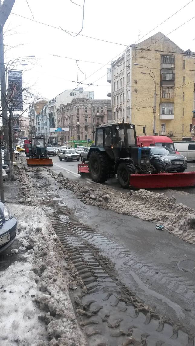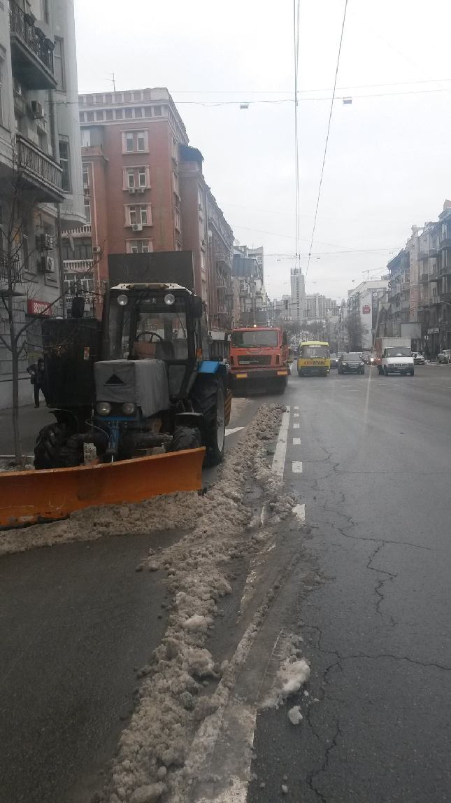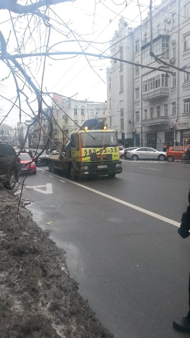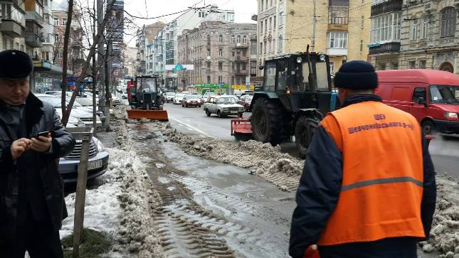 На вулиці Саксаганського працівники КП ШЕУ Шевченківського та Голосіївського районів спільно з Національною поліцією міста Києва звільняють смугу громадського транспорту від залишків снігу та припаркованих з порушенням ПДР автомобілів