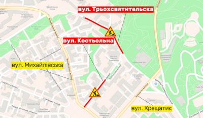 НА ВУЛИЦЯХ КОСТЬОЛЬНІЙ І ТРЬОХСВЯТИТЕЛЬСЬКІЙ ЧАСТКОВО ОБМЕЖАТЬ РУХ З 5 ДО 27 ЧЕРВНЯ