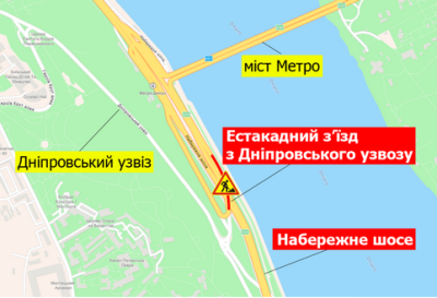 ПІД ЕСТАКАДНИМ З'ЇЗДОМ З ДНІПРОВСЬКОГО УЗВОЗУ ЧАСТКОВО ОБМЕЖАТЬ РУХ