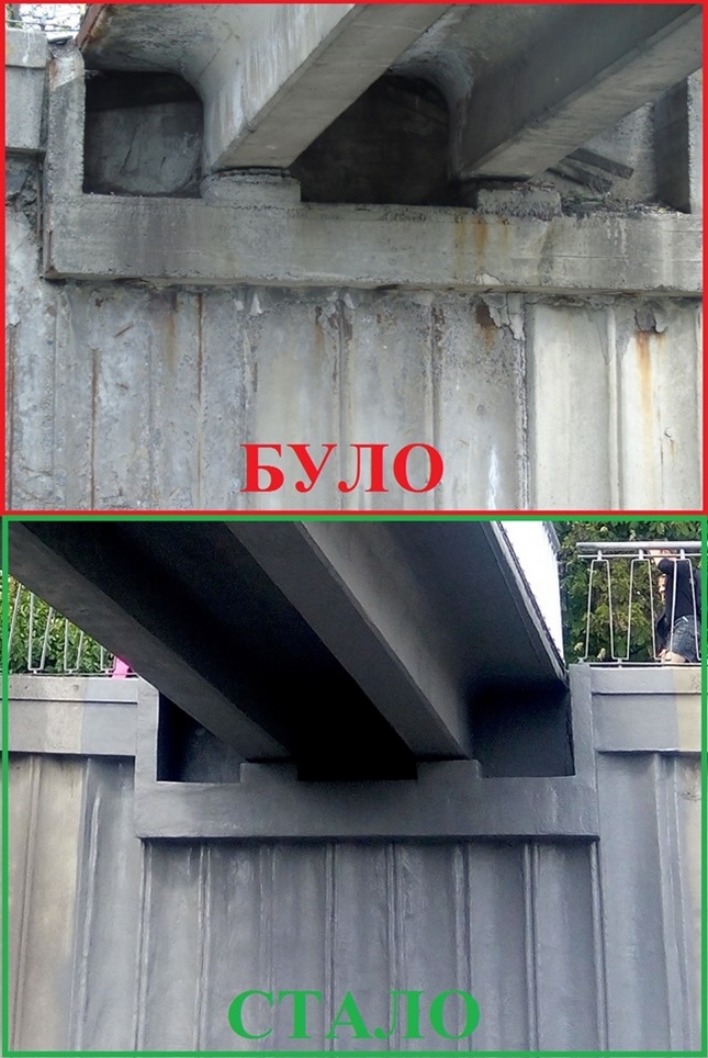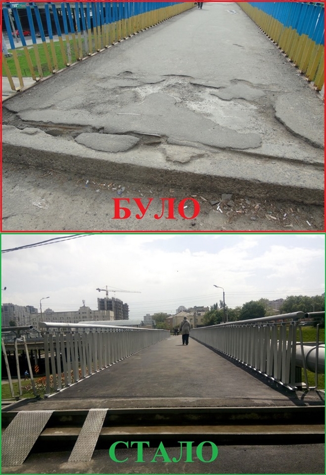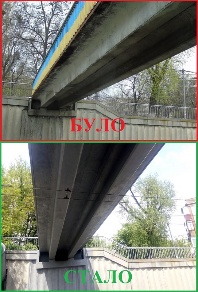 Проте, краще один раз побачити! На фото: пішохідний міст на перетині вул. Борщагівської та вул. Вадима Гетьмана «до» і «після» виконання ремонтних робіт.