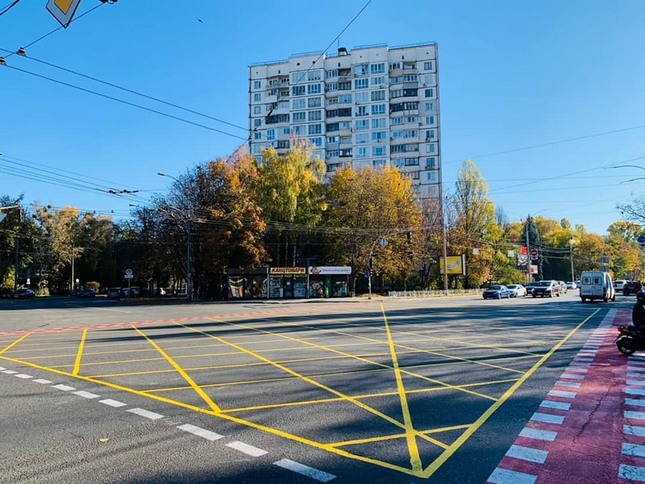 Крім цього, на вул. Солом'янській на перехрестях з вул. Волгоградською / вул. Андрія Головка та вул. Максима Кривоноса / вул. Генерала Шаповала вперше у столиці влаштували КОРОБЧАСТУ РОЗМІТКУ.
