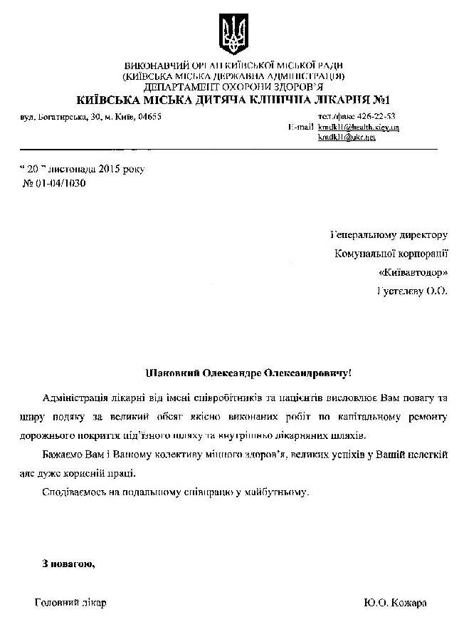 Подяка від Адміністрації Київської Міської дитячої клінічної лікарні №1 по вул.Богатирська 30, за якісний капітальний ремонт під'їзної дороги та прилеглої території