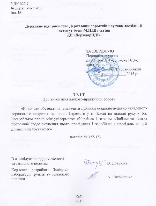 З метою з’ясування достовірних причин виникнення просідань, корпорація «Київавтодор» звернулась до профільного наукового закладу ДП «ДерждорНДІ» ім. М.П.Шульгіна з проханням провести науково-практичні дослідження. За результатами дослідження було встановлено, що причиною виникнення просідань є аварія яка виникла на інженерних мережах.