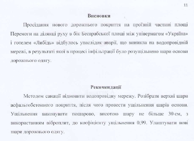 Протягом трьох тижнів після завершення робіт з капітального ремонту пл. Перемоги на ділянці руху в бік Бессарабської площі між універмагом «Україна» і готелем «Либідь» було виявлено просідання проїзної частини
