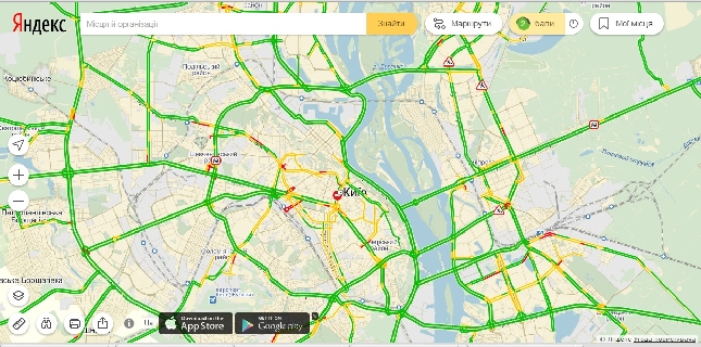 За даними сервісу «Яндекс.Пробки», на дорогах столиці рух не ускладнено – за 10-бальною шкалою рівень заторів у Києві станом на 9:20 сягає 2 балів.