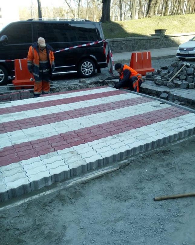 Комунальна корпорація «Київавтодор» неодноразово інформувала про позитивний досвід влаштування пішохідних переходів з кольорової бруківки червоно-білого кольору. З початком сприятливих погодних умов автодорівці продовжують практичне застосування запатентованого власного винаходу задля забезпечення безпечних умов руху пішоходів під час перетину проїжджої частини.