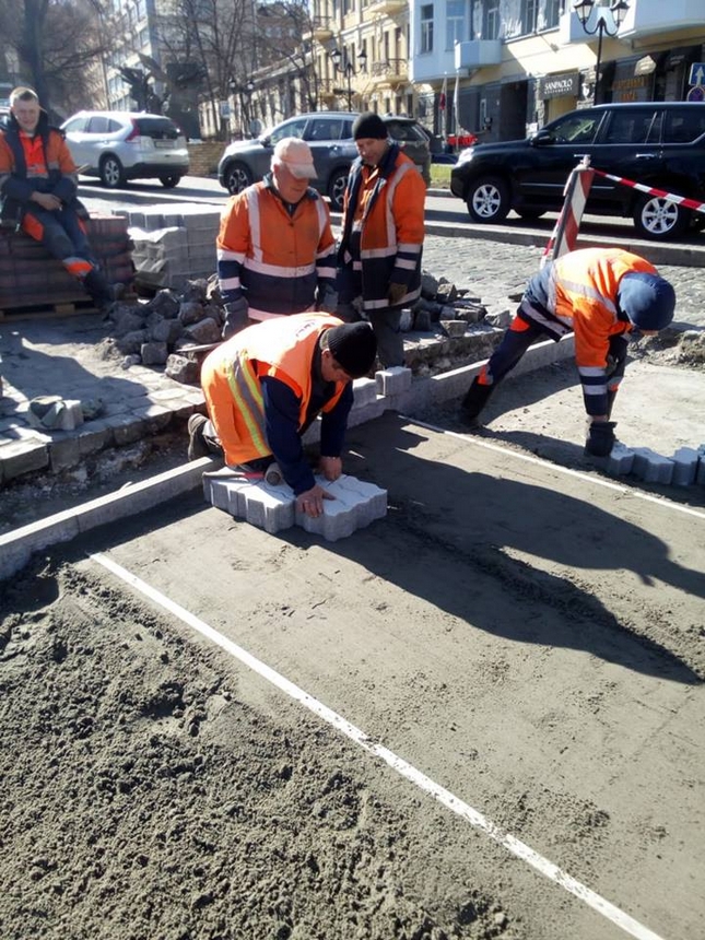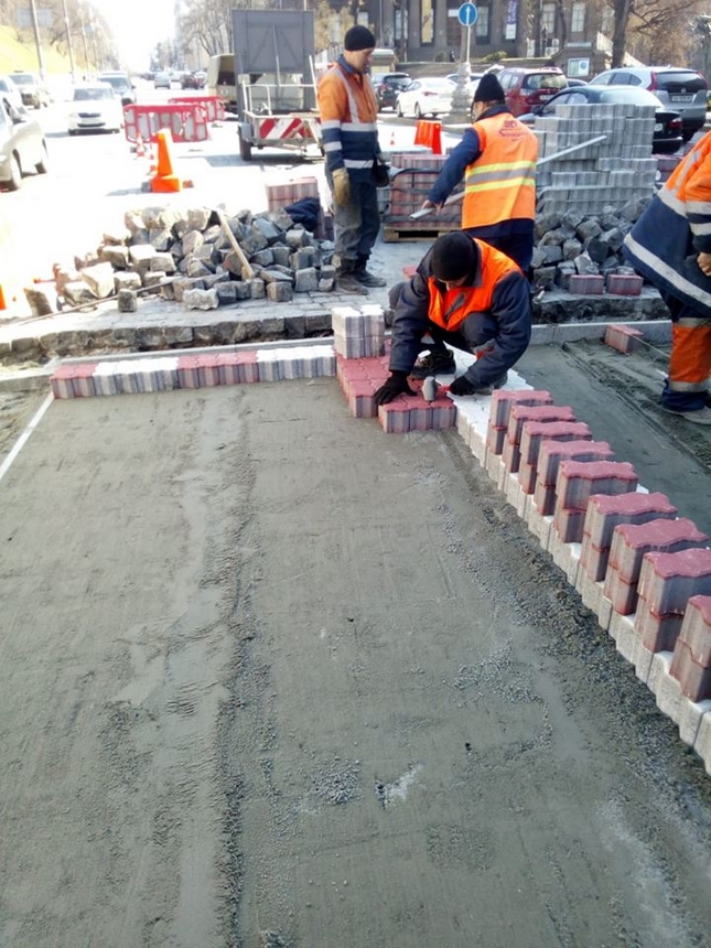 Наразі розпочато роботи з влаштування пішохідного переходу з кольорової бруківки на вул. Михайла Грушевського у Печерському районі міста Києва. І це лише початок цьогорічних робіт з впровадження таких переходів на вулично-дорожній мережі столиці, де дорожнє покриття виконано з бруківки.