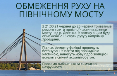 З 21:00 21 червня до 25 червня триватиме ремонт плити проїзної частини ділянки мосту над р. Десенка. У зв’язку з цим буде обмежено 2 і 3 смуги руху у напрямку Троєщини.