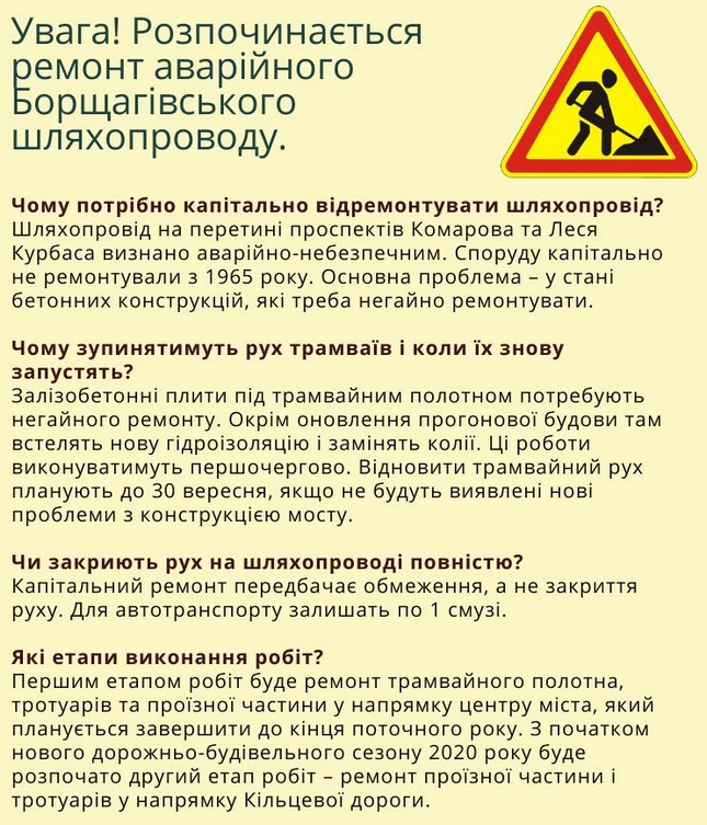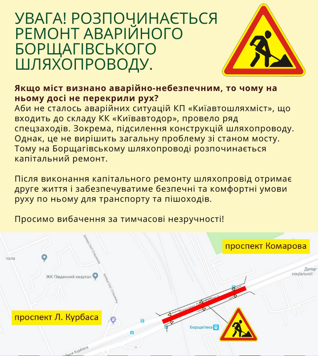 3 22 червня розпочинається капітальний ремонт шляхопроводу на перетині проспектів Комарова та Леся Курбаса із залізницею Київ-Волинський – Святошино (біля платформи «Борщагівка»).
