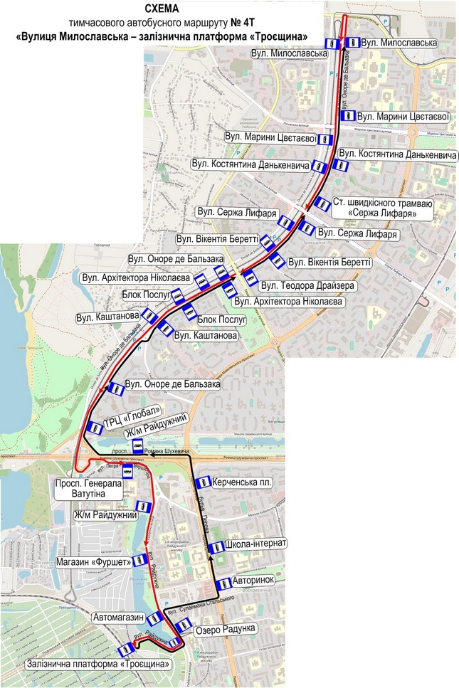 - організовується робота тимчасового автобусного маршруту № 4-Т «Вул. Милославська – зал. пл. «Троєщина» по трасі: вул. Оноре де Бальзака (від вул. Милославської) – просп. Романа Шухевича – вул. Петра Вершигори – вул. Райдужна – зал. пл. «Троєщина» – вул. Райдужна – вул. Сулеймана Стальського – бульв. Перова – просп. Романа Шухевича – вул. Оноре де Бальзака (до вул. Милославської);