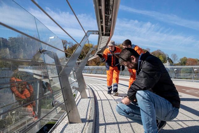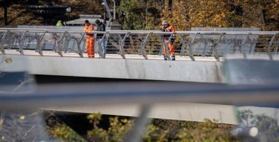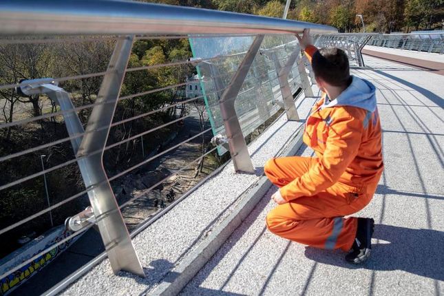 Віталій Кличко: "Сьогодні на пішохідно-велосипедному мосту фахівці демонтували пошкоджені вибухом російської ракети елементи скла."