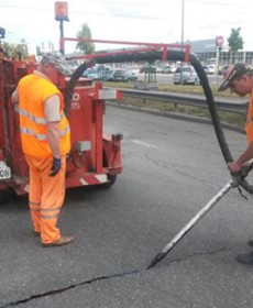 Такі роботи дозволяють значно подовжити термін сталої роботи проїзної частини, що у свою чергу дозволить значно заощадити бюджетні кошти на подальших ремонтах. Роботи виконуються за допомогою плавильно-заливного котла фірми Crafco серії Super Shot.